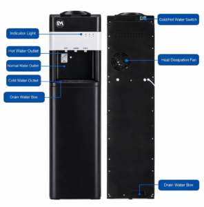 Built with a sleek standing structure, it features a spacious storage cabinet at the bottom for added functionality. The dispenser delivers fast heating and efficient cooling, ensuring you always have water at your desired temperature. Its durable construction and modern black finish make it a practical and stylish addition to any space.