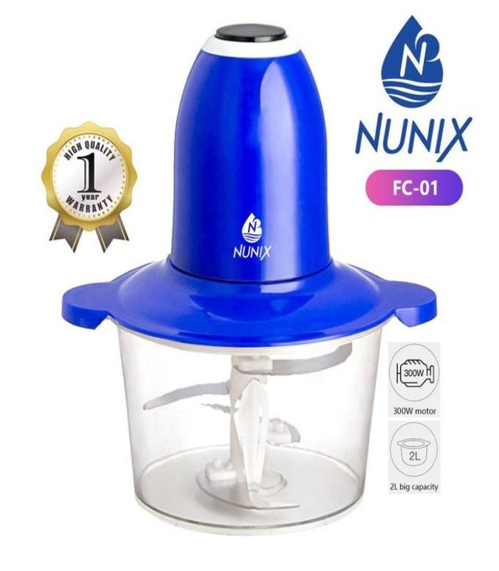 The Nunix (FC-01) Electric Chopper is elegant and very useful to households. The food chopper gives your kitchen an elegant and premium look. It has safety features; the ON/OFF safety switch and the anti-slip rubber feet that ensures that the food chopper is stable and doesn’t move around on the kitchen counter. The powerful 300W motor and stainless steel blades enables one to chop vegetables easily and quickly. The 2 Litres jar allows you to collect the chopped foods easily*color variations: green, red, blue, cream *motor power: 300W*voltage:220-240V *frequency:50/60Hz*jar capacity: 2L*stainless steel blades*S-shaped steel blades*multi-function food chopper (meat grinding – mince meat, carrots, cabbages, cucumbers, dry peppers,… ) *convinient, easy to use and clean*motor overheating protection*transparent bowl*produces low noise
