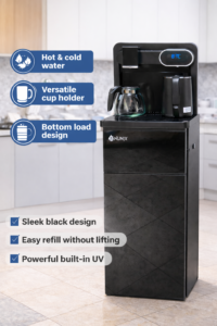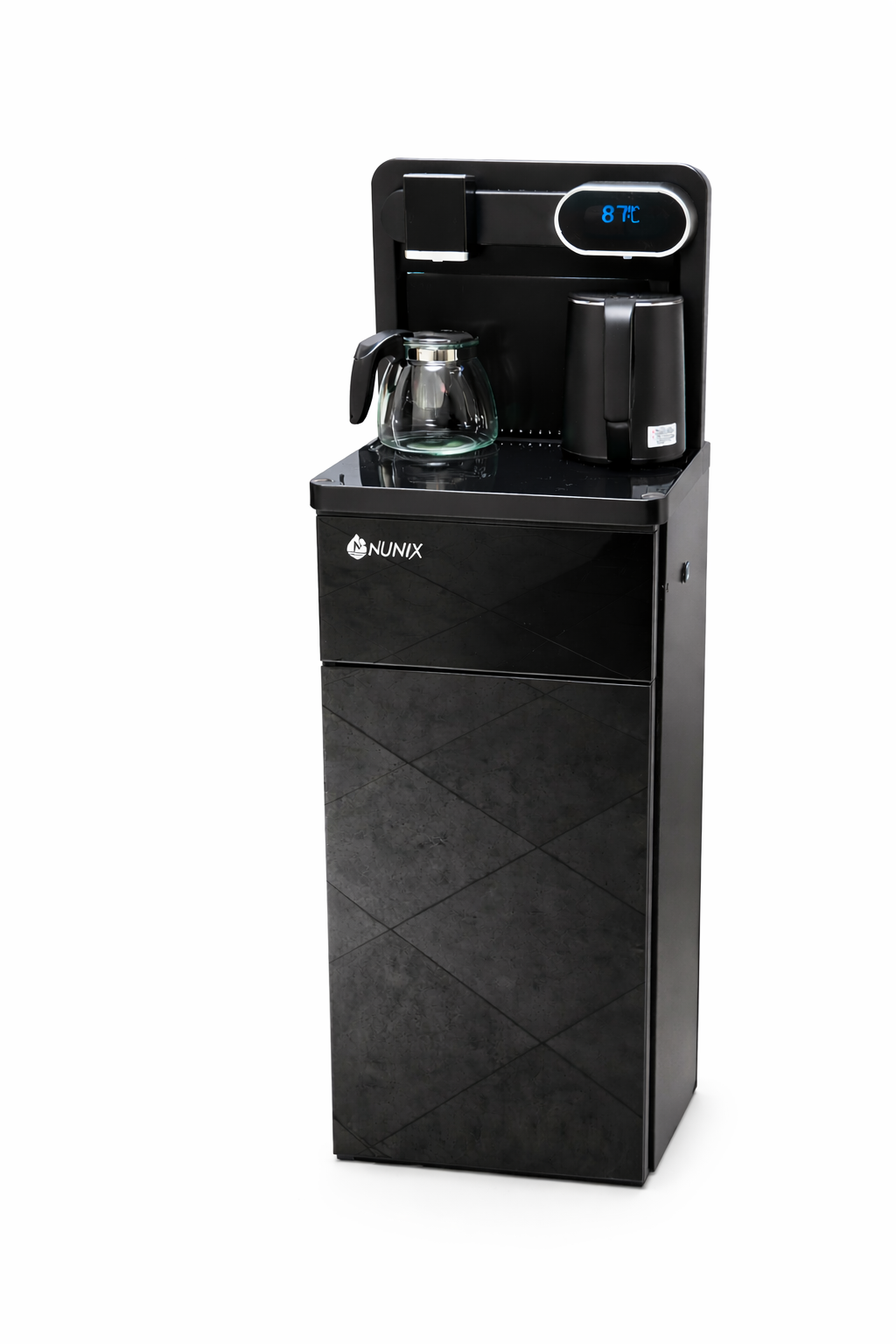 Bring style and entertainment into your space with the Nunix A1C-X2 water dispenser. Designed in a sleek black finish, it features a bottom-load system for easy bottle replacement and delivers both hot and cold water instantly. The built-in music system adds a unique touch, letting you enjoy your favorite tunes while staying refreshed. Perfect for modern homes and offices looking for convenience with a twist