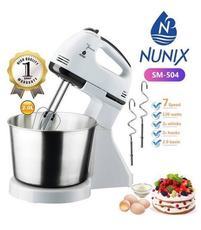 This new hand mixer with bowl helps put your favorite recipes to the test. With a 120 watts motor and five speed settings, this hand mixer can tackle the toughest tasks at the right power of your choice. Either place the hand mixer on the stand to have your hands free or use the hand mixer without the stand for more manual control. Comes with stainless steel bowl of 2liter capacity for liquid and 1kg capacity for dry food. Make your cooking an effortless creative pleasure with this Hand Mixer