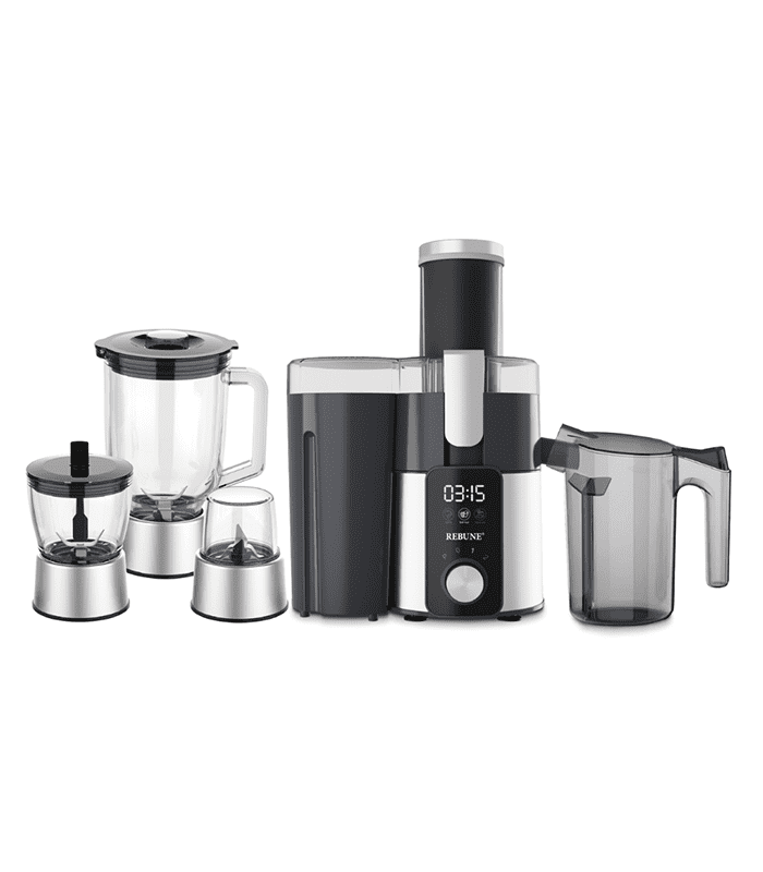 *75 diameter feed tube, 1000ml juice cup,2000ml pulp container with 60g glass dry grinder, 500g glass chopper and 1.5L glass blender jug