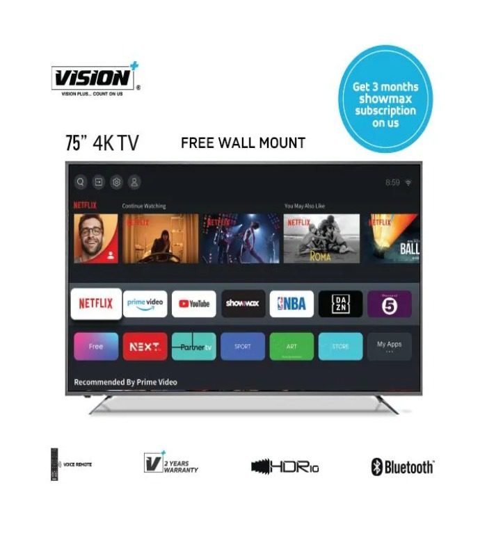Immerse yourself in breathtaking 4K HDR detail with the VISION PLUS 75” 4K UHD V SERIES SMART TV 2022 MODEL VP8875KV. 4K Ultra HD resolution delivers pin-sharp picture quality whilst HDR maximizes contrast and color accuracy. UHD enhances all of your favorite sports, TV shows and movies to super clear, near-4K quality effortlessly. VISION PLUS ‘s VIDAA Smart TV OS lets you enjoy all your favorite entertainment from Netflix, Prime Video, Free view Play and more, and kidoodle tv.